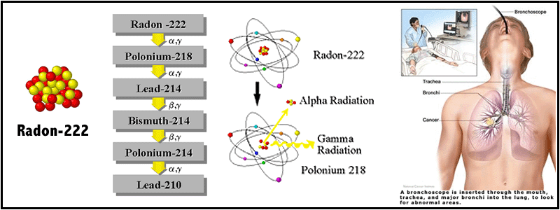 The Two major radon decay products of radon are Polonium 214 and Polonium-218 which are both Alpha Particles. When these particles are inhaled into the lungs they can cause cell tissue damage and DNA mutations. Radon Decay Products are chemically reactive, solid particles, heavy metals and create static charges.